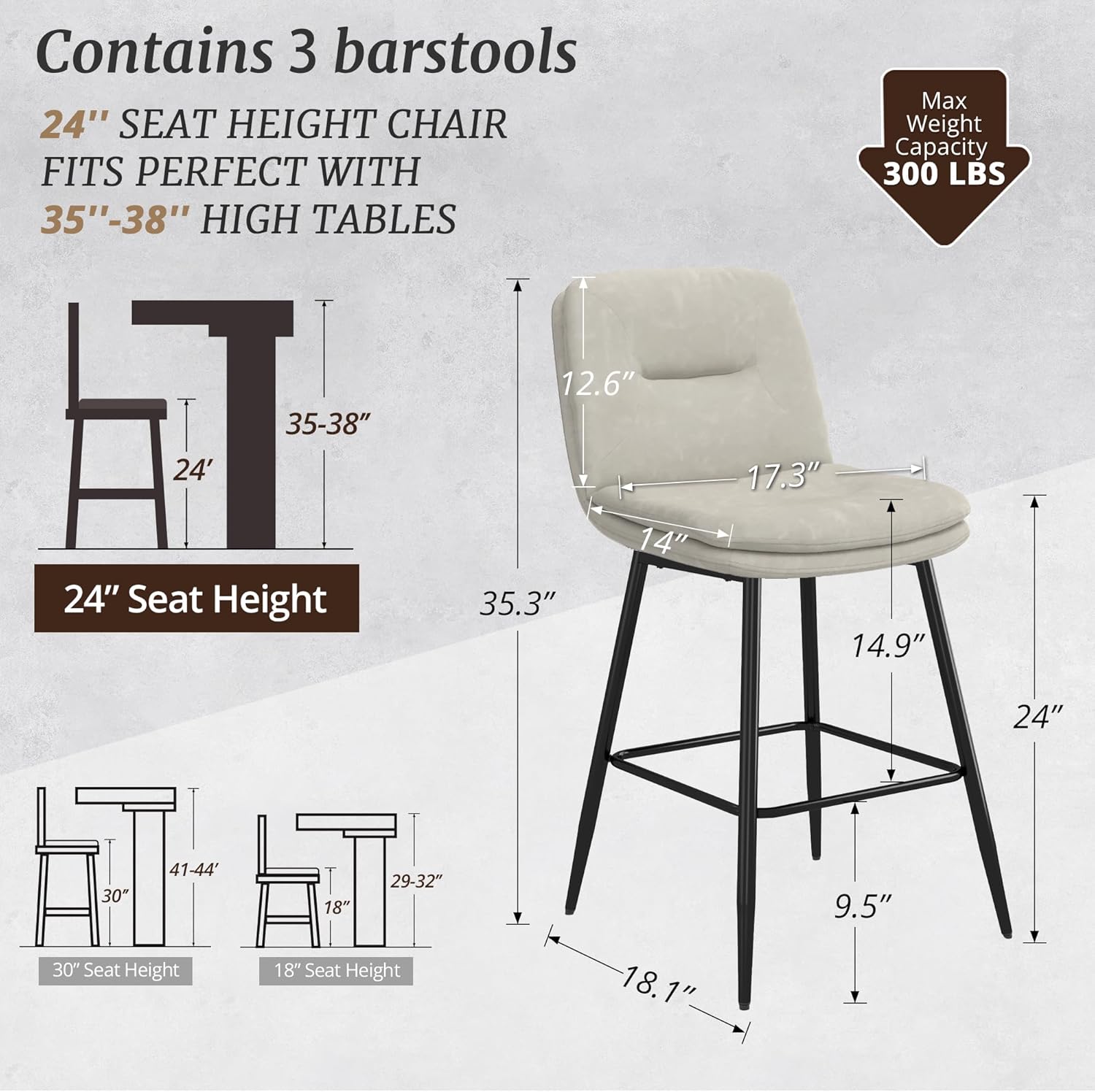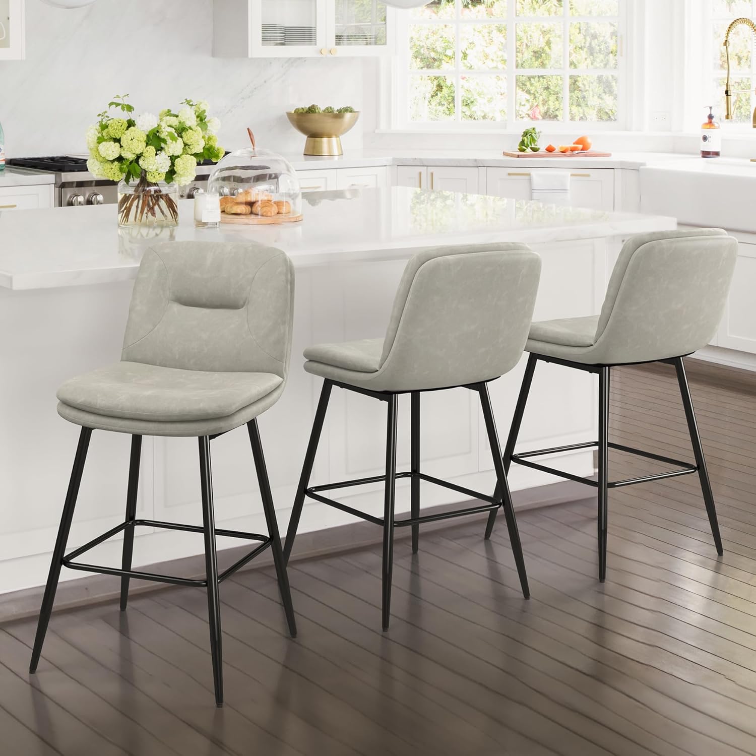 Bar Stools Set of 3, Double-Layer Upholstered Counter Height Bar Stools for Kitchen Island, Faux Leather Barstools with Back and Footrest, 24 Inch Armless Barstool Chairs, Light Beige Gray