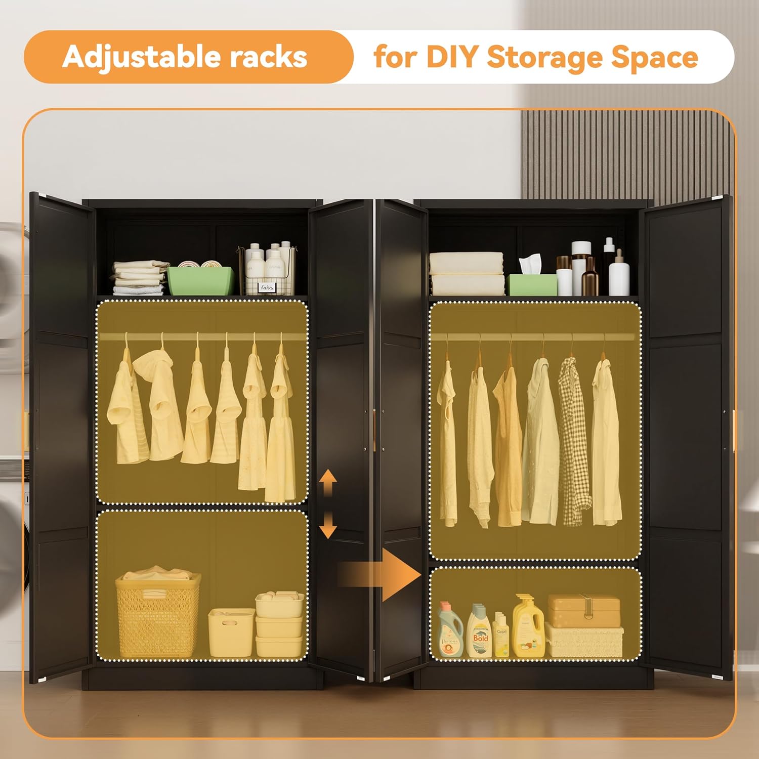 Constructed with durable metal, this storage closet cabinet is built to last and can easily withstand daily use. The hanging rail provides a convenient space to hang your clothes, while the adjustable shelves allow you to customize the interior to accommodate items of various sizes.