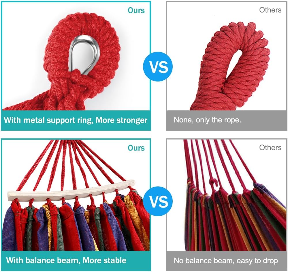The hammock comes equipped with two anti-roll balance beams, ensuring stability while you sway gently in the breeze. The sturdy metal knot tree straps make it easy to set up your hammock wherever you go, whether it’s in the woods while camping, on your patio, or in your backyard.